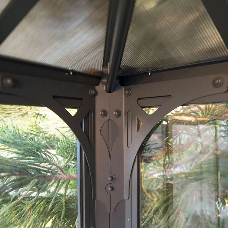 This gazebo with sides comes with treated, bronze-tinted 6mm multi-wall polycarbonate roof panels, which transmit natural light while providing shade and blocking harmful UV rays, offering you a beautifully light environment, which is never uncomfortably bright. The side panels are made from 3mm polycarbonate, which is crystal clear, very resilient and far safer than conventional glass.