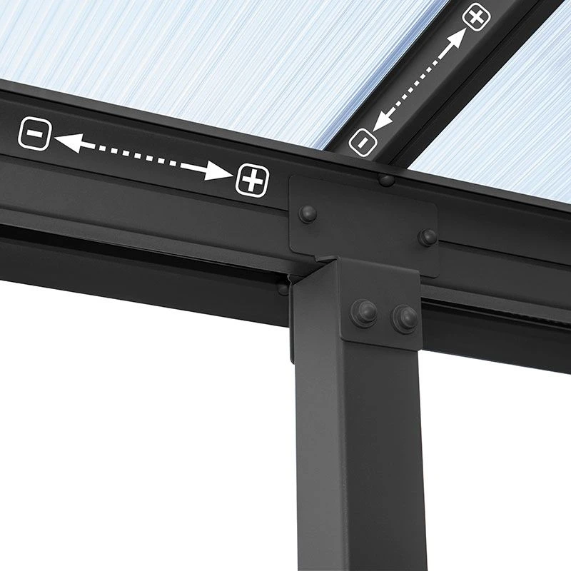This polycarbonate patio cover also features a heavy-duty, powder-coated aluminium frame, powder-coated aluminium profiles and laser-cut galvanised steel connectors, all of which are robust, durable and impervious to rust.