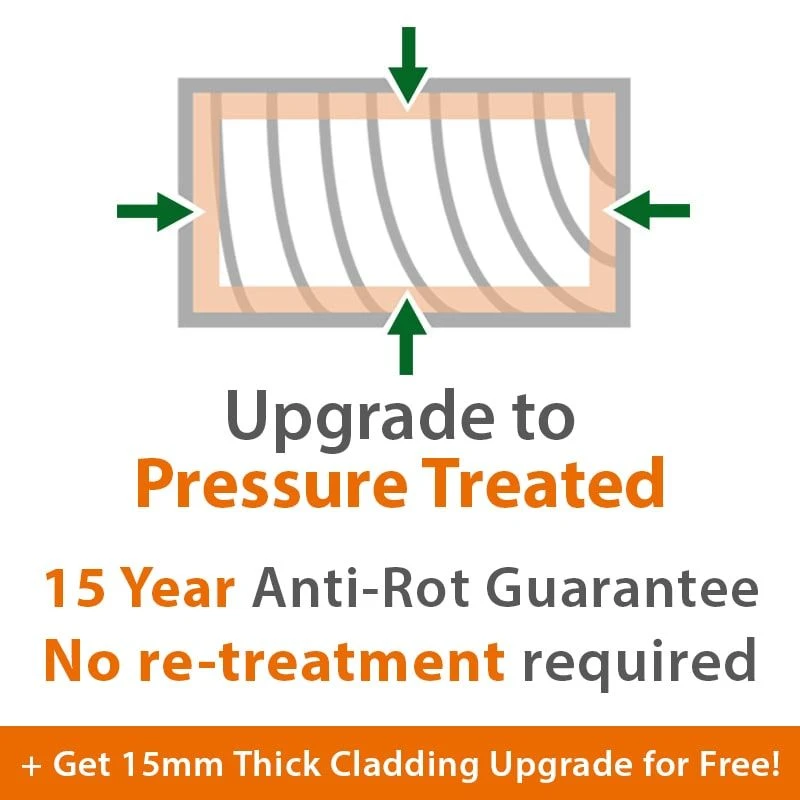 If you upgrade to pressure-treated wood, the anti-rot guarantee is extended to a super 15 years. Furthermore, we will MATCH YOUR UPGRADE by fitting your new garden building with superior 15mm cladding for FREE. Please be advised that waterproofing is still required within a month of assembly and annually thereafter.