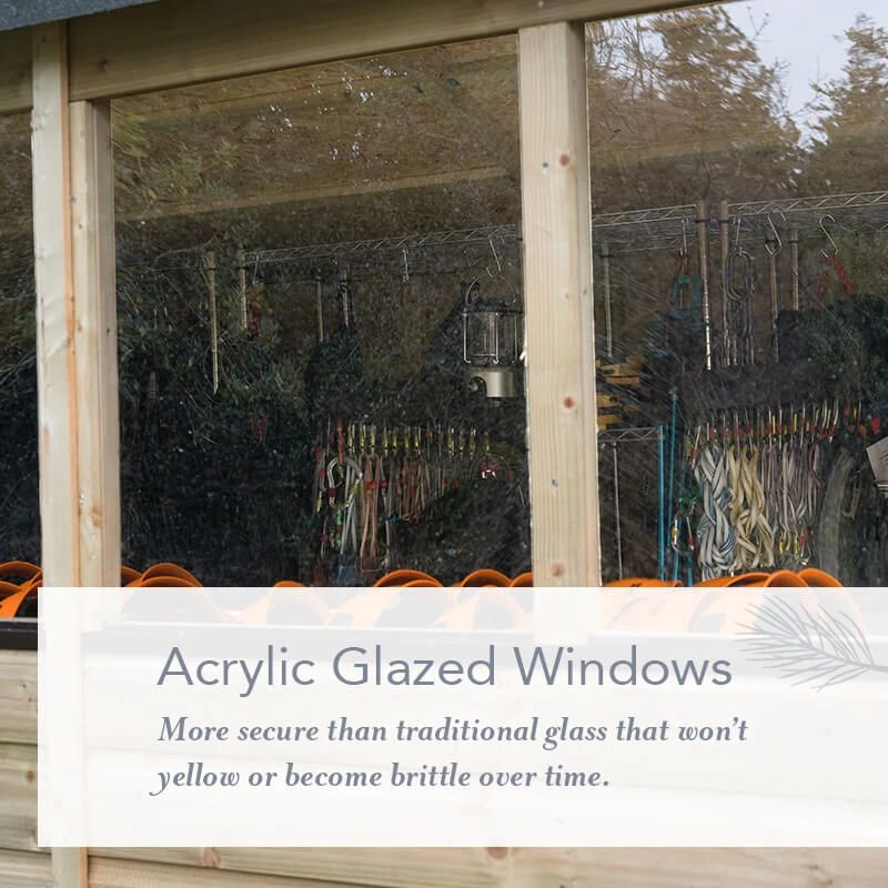 Once inside, you’ll find the high roofline allows plenty of headroom, along with the chance to store taller items. The 4 3mm acrylic windows provide an abundance of natural light – perfect if you’re storing important equipment or working on DIY projects. These windows are completely shatterproof and will neither discolour nor fade over time. You can install them in a variety of positions – again, the choice is yours.