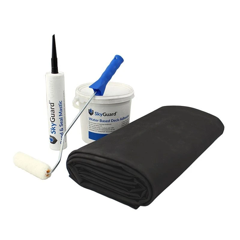 SkyGuard comes in one piece making it easy to handle and fit, plus it looks great! The kit includes the roof membrane itself, water-based deck adhesive, adhesive applicator and edge sealant.