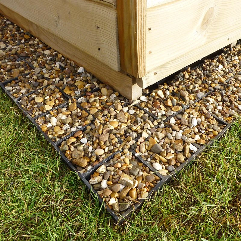 To install the base, you simply interlock the square grids together and lay onto a firm, level area of ground. We recommend using 15kg of 10m pea gravel per square (gravel not included).