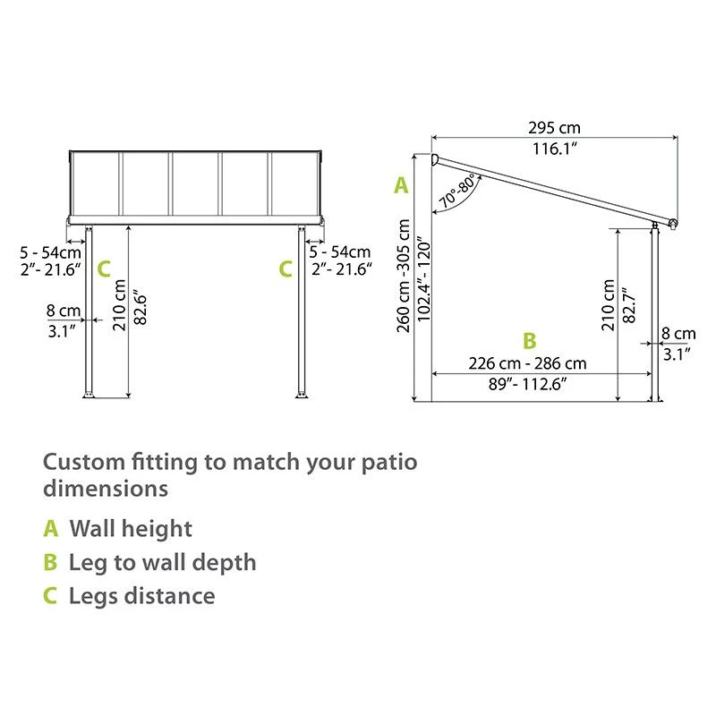 Thanks to the adjustable wall mounting plate and flexible pole positioning, you can set the patio cover’s height, distance from your house and pole spacing to your own requirements.