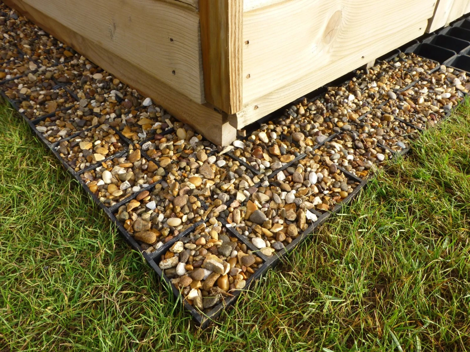To install the base, you simply interlock the square grids together and lay onto a firm, level area of ground. We recommend using 15kg of 10m pea gravel per square (gravel not included).