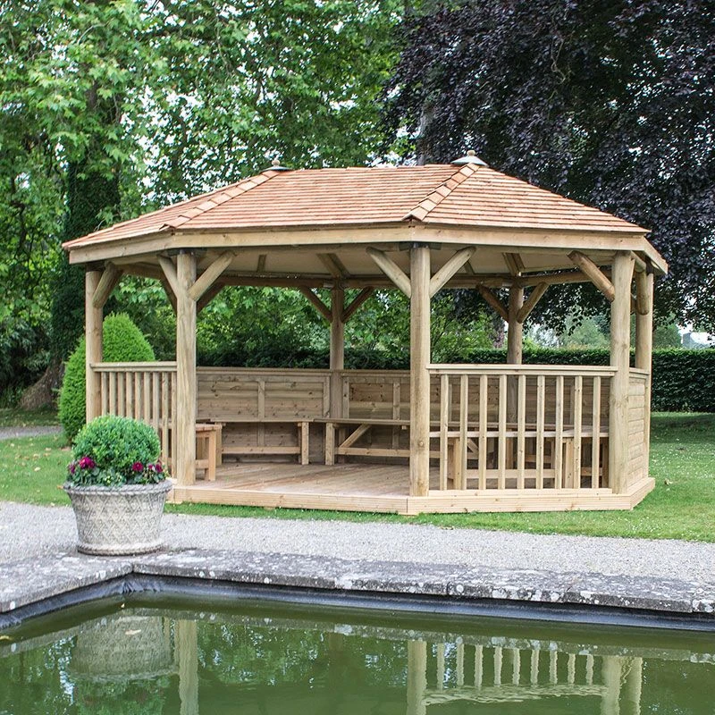 Crafted to the highest possible standard, here, in the UK, the 5.1m Premium Oval Wooden Gazebo with Cedar Roof and Benches seats up to 22 adults or 29 children, offering those of you who are hoteliers, represent schools or, of course, have larger gardens the perfect outdoor sheltered space.