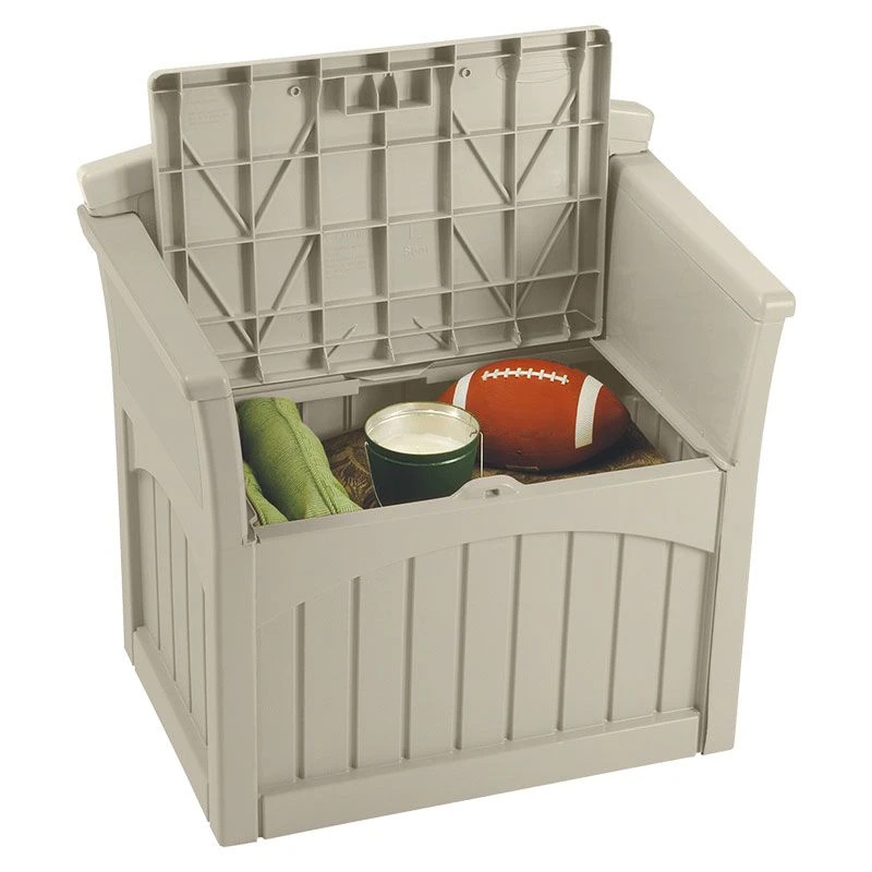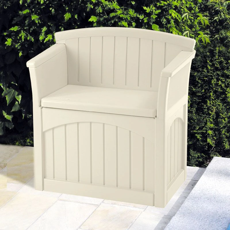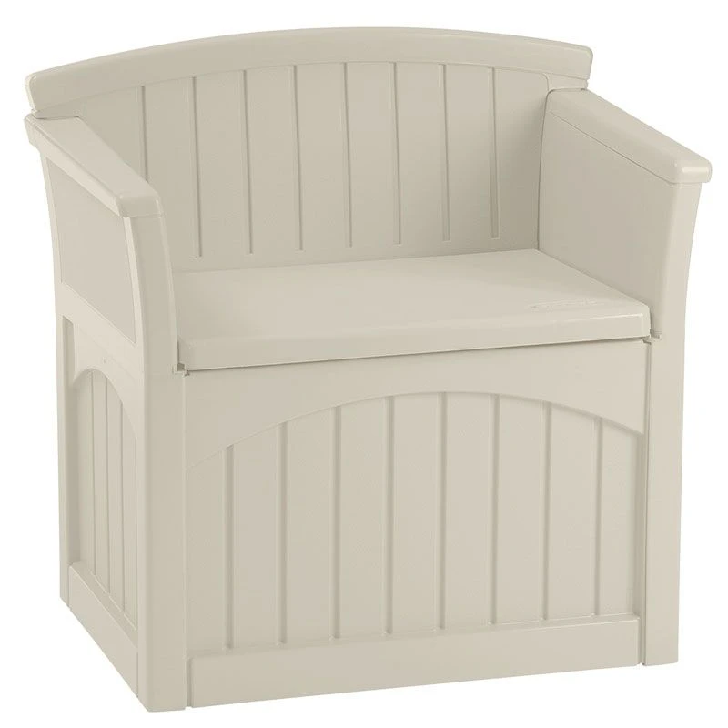 This suncast patio seating is constructed from UV stable durable plastic resin which creates a sturdy build and is styled in a light taupe finish. Its strong build allows for a large 117 litre capacity and is perfect for storage indoors or out. It makes ideal storage for smaller items such as barbecue untensils or play items and garden tools.