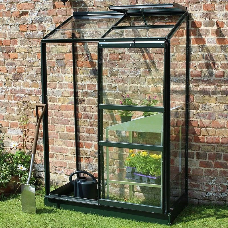 A small greenhouse perfect for small gardens or beginner gardeners, the Wall Garden 24 with green frame from Halls Greenhouses is a charming lean-to greenhouse.