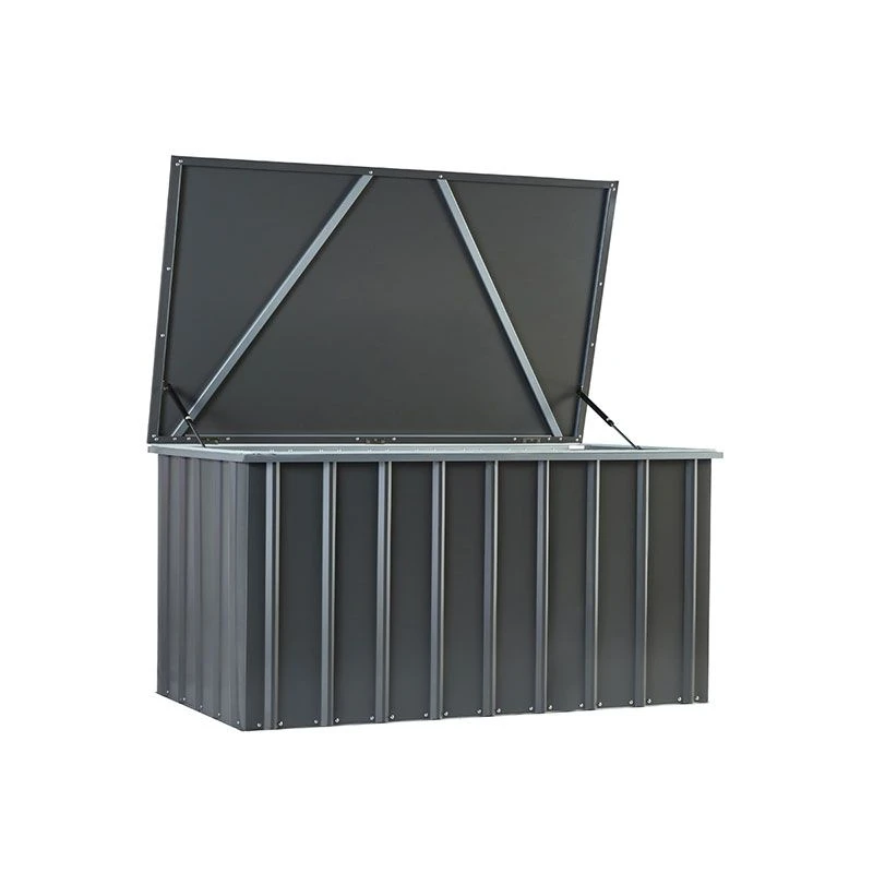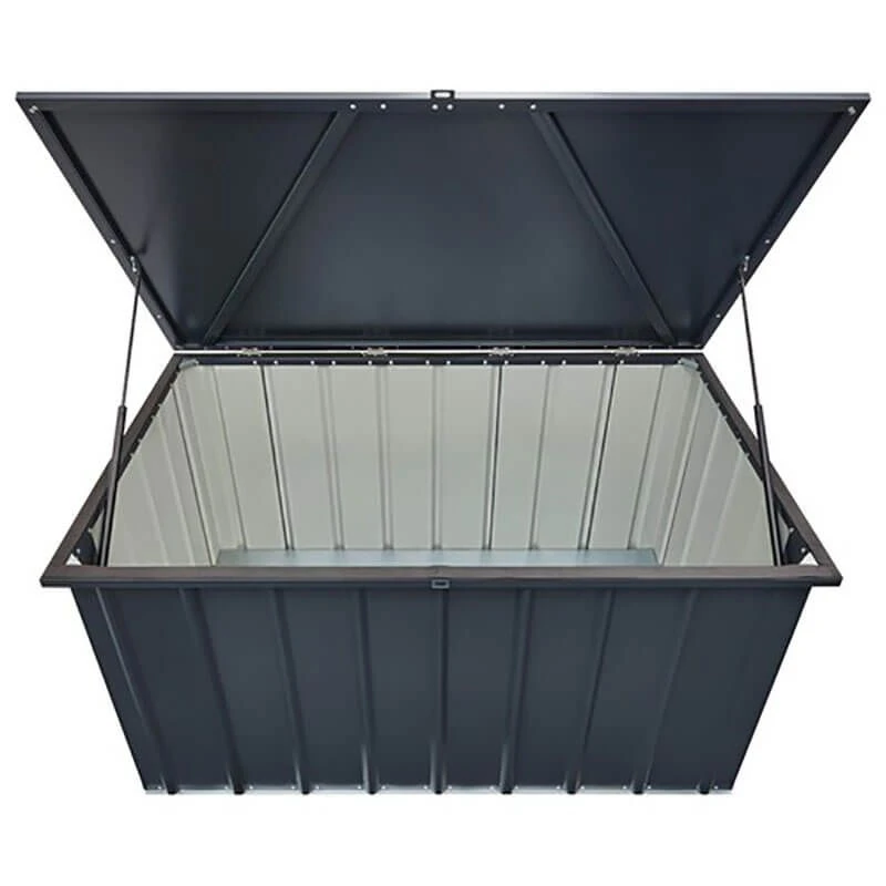 Constructed from hot-dipped galvanised steel, the solid and resilient design includes reinforced grooved panels and corners. The fully overlapping, heavy duty lid and integral floor also ensure rain and unwanted pests are kept out, keeping your belongings safe and dry. The reinforced lid has 2 hydraulic arms making opening effortless, with a padlock point ready for use if you require additional security.