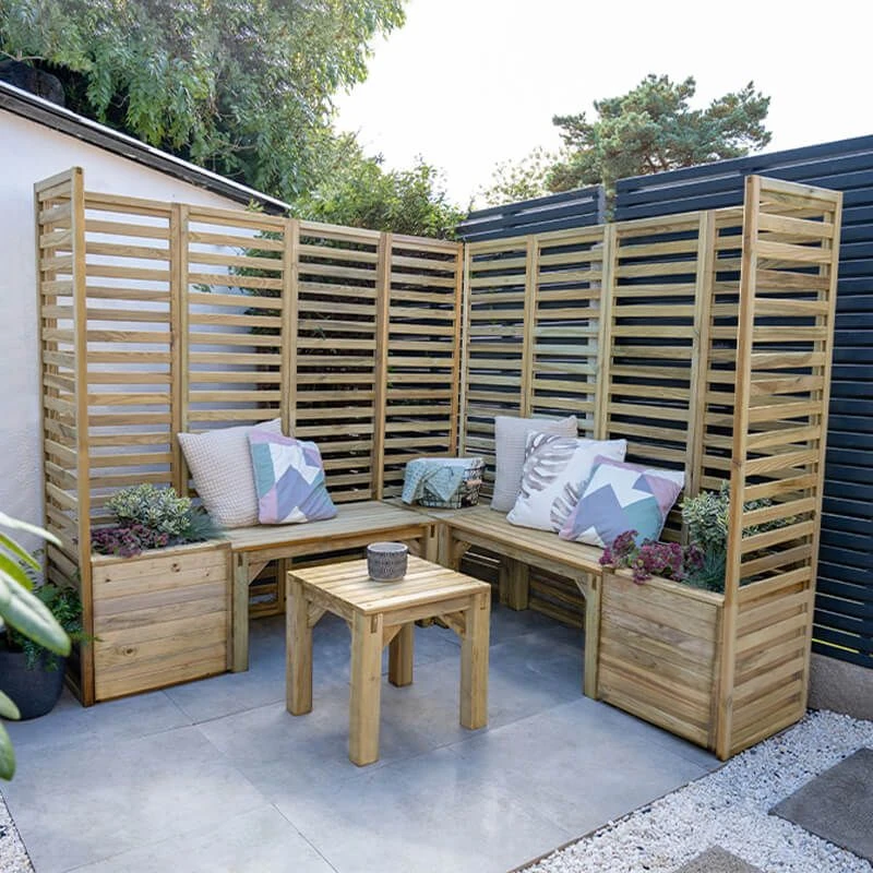 This sensational garden seating set comprises of 2 garden seats/ tables, 2 benches, 2 square planters and 10 trellis panels, all of which are built from the finest timber and rounded off with a sumptuous smooth-planed finish.