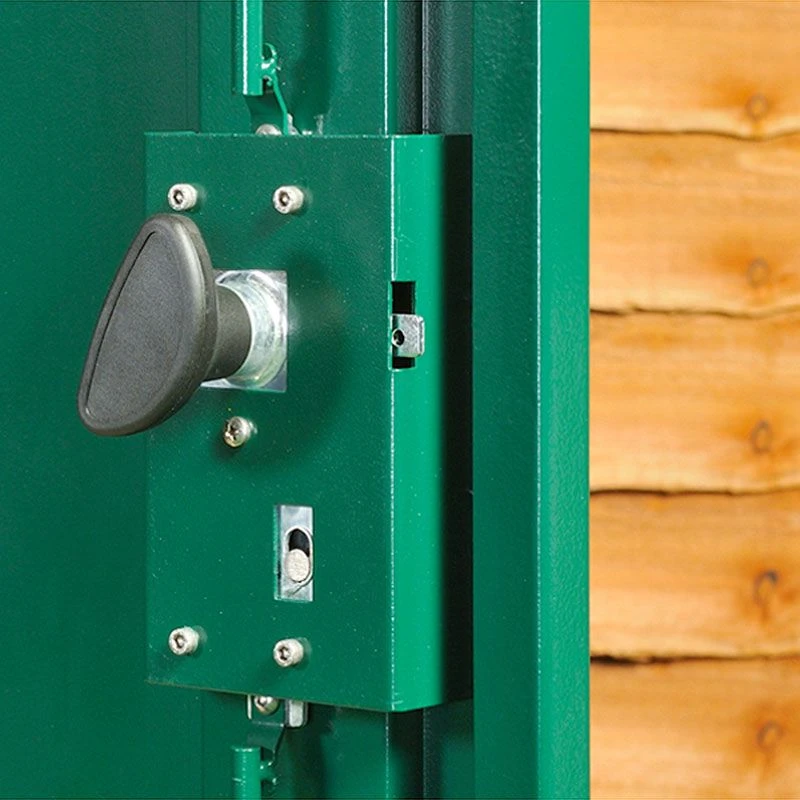 An integral rain guard keeps the elements at bay, whilst the metal floor with fixing bolts protects your stored items from ground moisture and helps you secure the unit to a solid base.