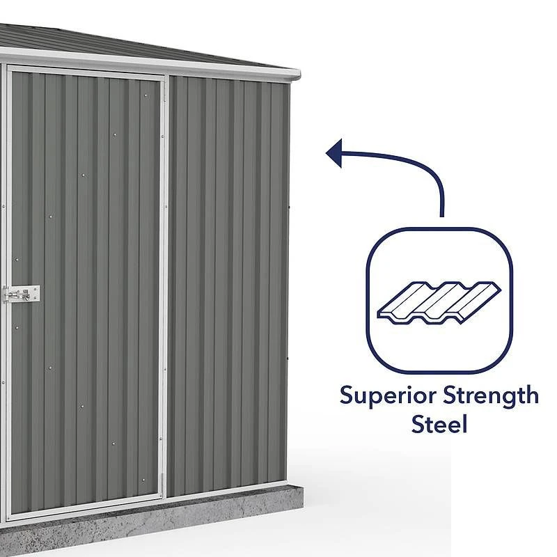 This garden shed is expertly built in Australia from Bluescope high-tensile steel, which makes it incredibly robust, exceptionally durable and completely watertight, while the grey colour-bond painted finish ensures an exceptionally eye-catching appearance. Furthermore, it is wind tested to 147kmph (when anchored to a solid base), so you can rest assured that any stored items will enjoy COMPLETE weatherproof protection.