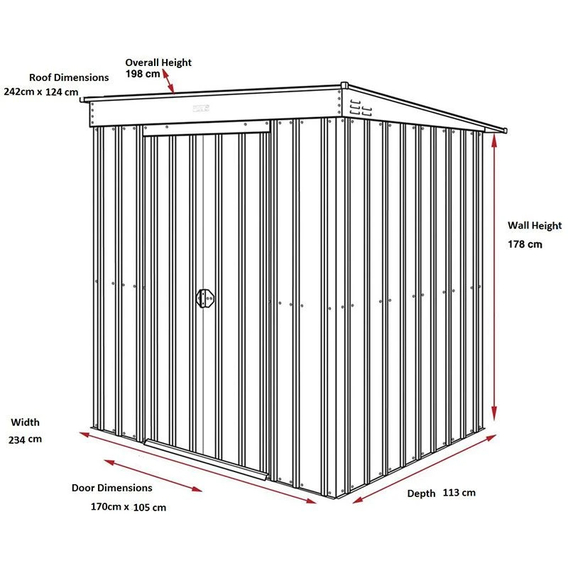 In traditional heritage green this attractive shed is sure to complement your garden. This pent roof shed has higher eaves than most to provide extra headroom for you and more storage space for your garden equipment. Ventilated gables combat condensation and improve airflow. Even the door and track are designed for strength and simplicity. This shed is also perfect for caravan parks where non-combustible storage sheds are compulsory.