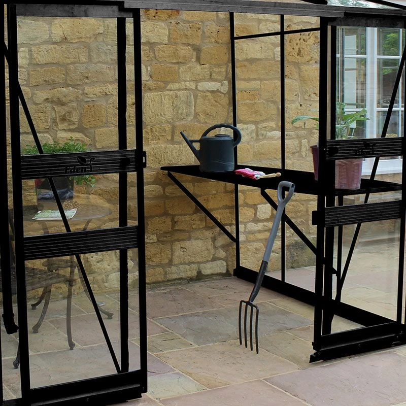 You can purchase a model of this aluminium greenhouse in 3 different sizes, and with a black, green or silver-coloured frame; the choice is entirely yours. Should you desire, there’s an option to upgrade to 6mm polycarbonate glazing on any of these models. If you wish to customise your new greenhouse, you can also purchase some great greenhouse accessories, including an automatic vent arm and 2-tier potting bench.