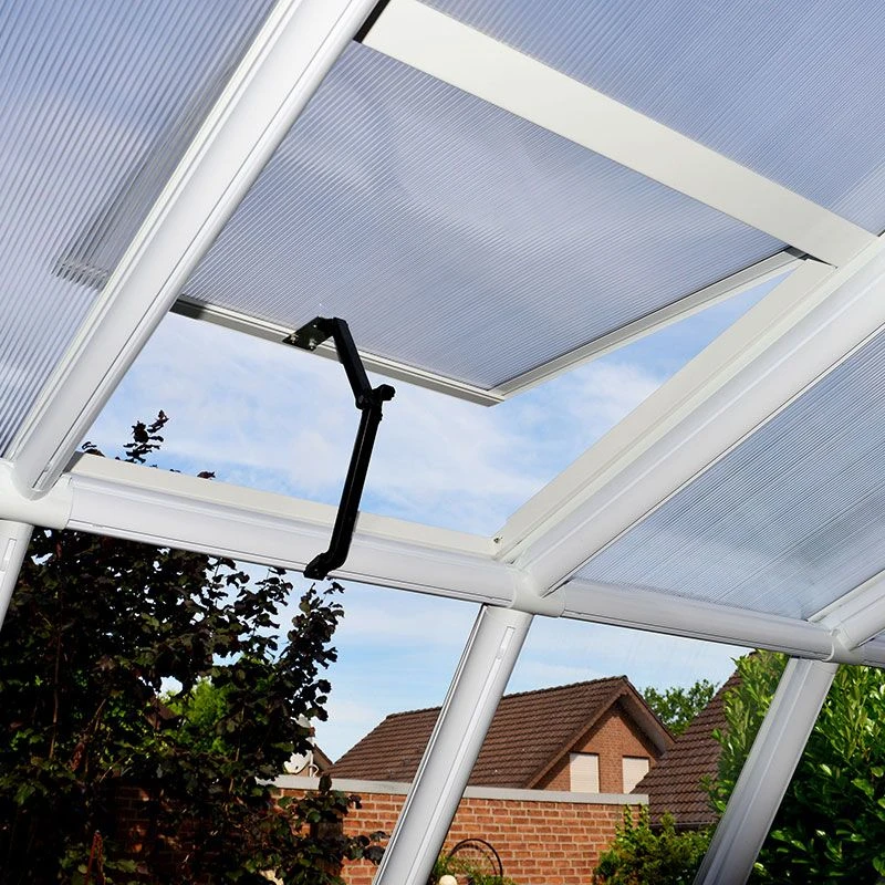 - 4mm twin-wall polycarbonate roof panels and 3mm crystal-clear polycarbonate side panels allow 82% light transmission