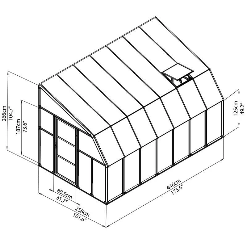 - 4mm twin-wall polycarbonate roof panels and 3mm crystal-clear polycarbonate side panels allow 82% light transmission