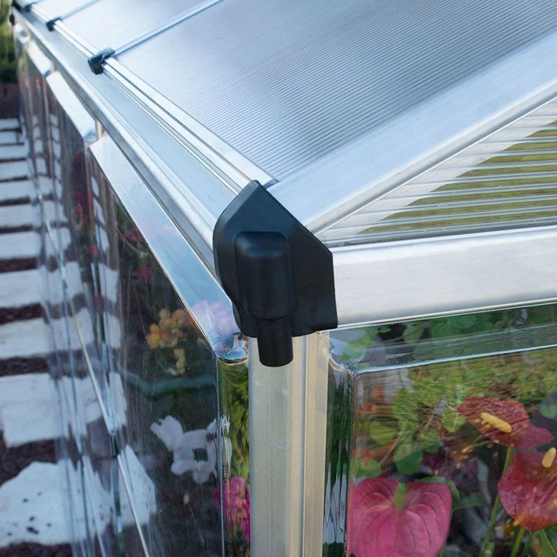 The light-diffusing roof panels promote an even temperature by increasing thermal insulation and reducing extreme sunlight exposure. Both roof and side panels are completely UV-protected and shatterproof, and together they allow 82% light transmission. This means your plants will enjoy optimum growing conditions, you will be protected from harmful UV rays, and the panels will neither discolour nor fade in the sun.