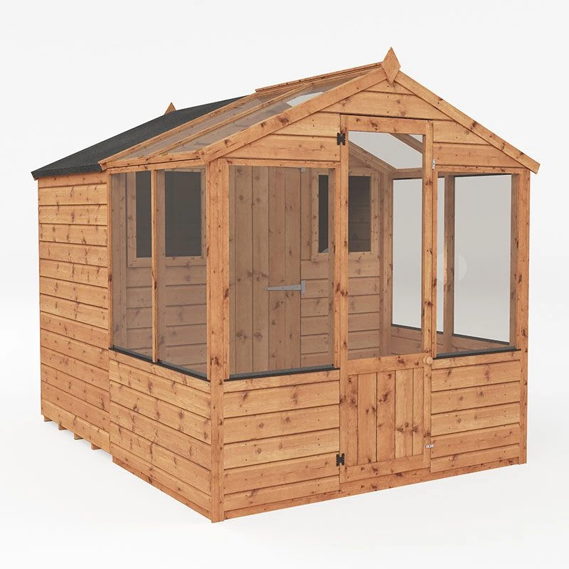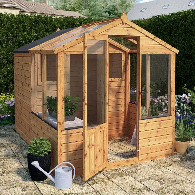 A charming 8×6 potting shed, this wooden greenhouse and shed combination enables you to enjoy growing your own veg or plants while stowing your garden tools, compost etc out of sight.