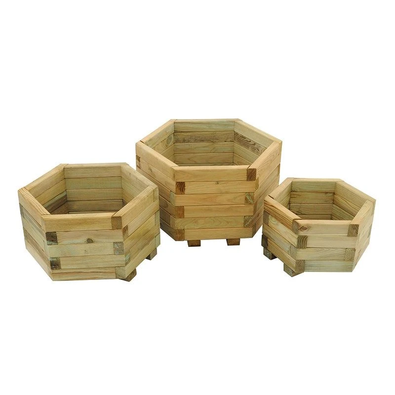 - Stylish set of three wooden planters in a striking hexagonal design