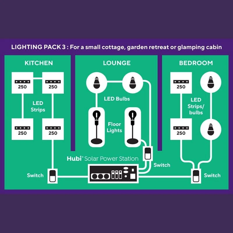 You can choose from 3 separate solar lighting packs, all of which can be mixed and matched with any of the 3 Premium Hubi Solar Power Stations. You should choose Power Station Light Pack 3 if you wish to illuminate a multi-room garden building or holiday cottage.