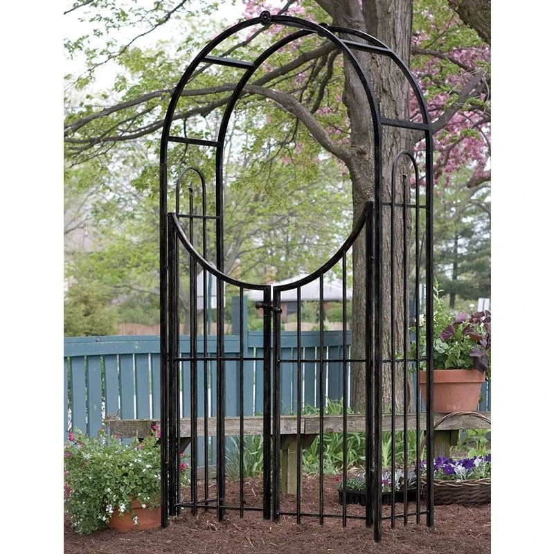 For the ideal entrance into a special part of your garden, choose the eye-catching and expertly crafted Panacea Sunset Metal Garden Arch with Gate in Black 7’5 x 4’1.