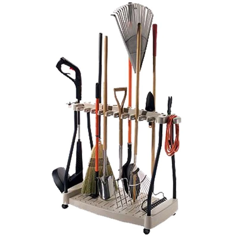 This clever suncast indoor tool rack has a side access design with clips which means that your tools simply pull out instead of having to lift tools out of the rack. The four wheels on the bottom allows you to easily move the storage around. The tall tools are positioned head down which adds weight to the base adding to stability. The overall structure has a steel core providing strength and stability.