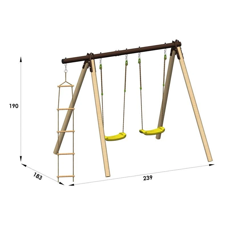 Supplied with an impressive 10-year anti-fungus guarantee on the wood, a 10-year anti-perforation guarantee on the steel and a 2-year guarantee on the plastic parts, this double swing set has dimensions of 190cm x 183cm x 239cm and includes clear instructions for a straightforward assembly.